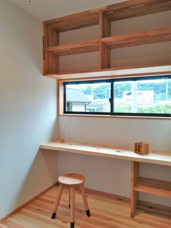 ご主人がこだわった、耳付きの桧の板を使用した書斎コーナーも