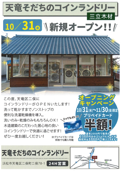明日10月31日ハロウィンの日に三立木材「天竜そだちのコインランドリー」