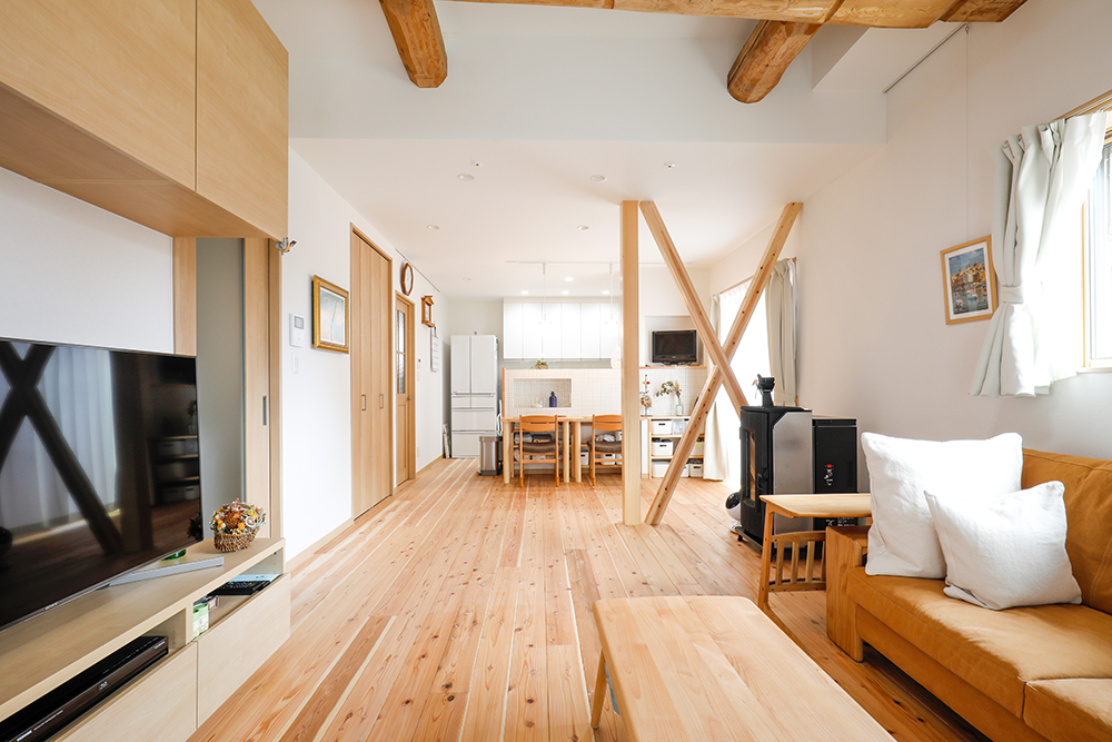 工事の開始に伴って、リビングの天井を開けたとき、家を支える大きな梁が見えて、感激もひとしおだったと語る奥様。
