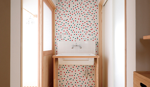 モデルハウス椿は、縦長の敷地を有効に生かすため、日当たりが良い2階の南面に浴室と洗濯室を設けてあります。また、室内干しを洗濯機のすぐ横に設けたことで動線が大幅に短縮され、家事ラクな暮らしを実現しました。