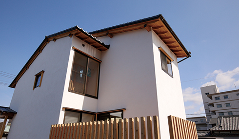 - 塗り壁仕上げ外壁にはスサ入り漆喰と地元の井伊谷の土を用いた天竜壁を採用。室内はざらりとした珪藻土の塗り壁仕上げが特徴です。調湿性や消臭効果に優れてます。