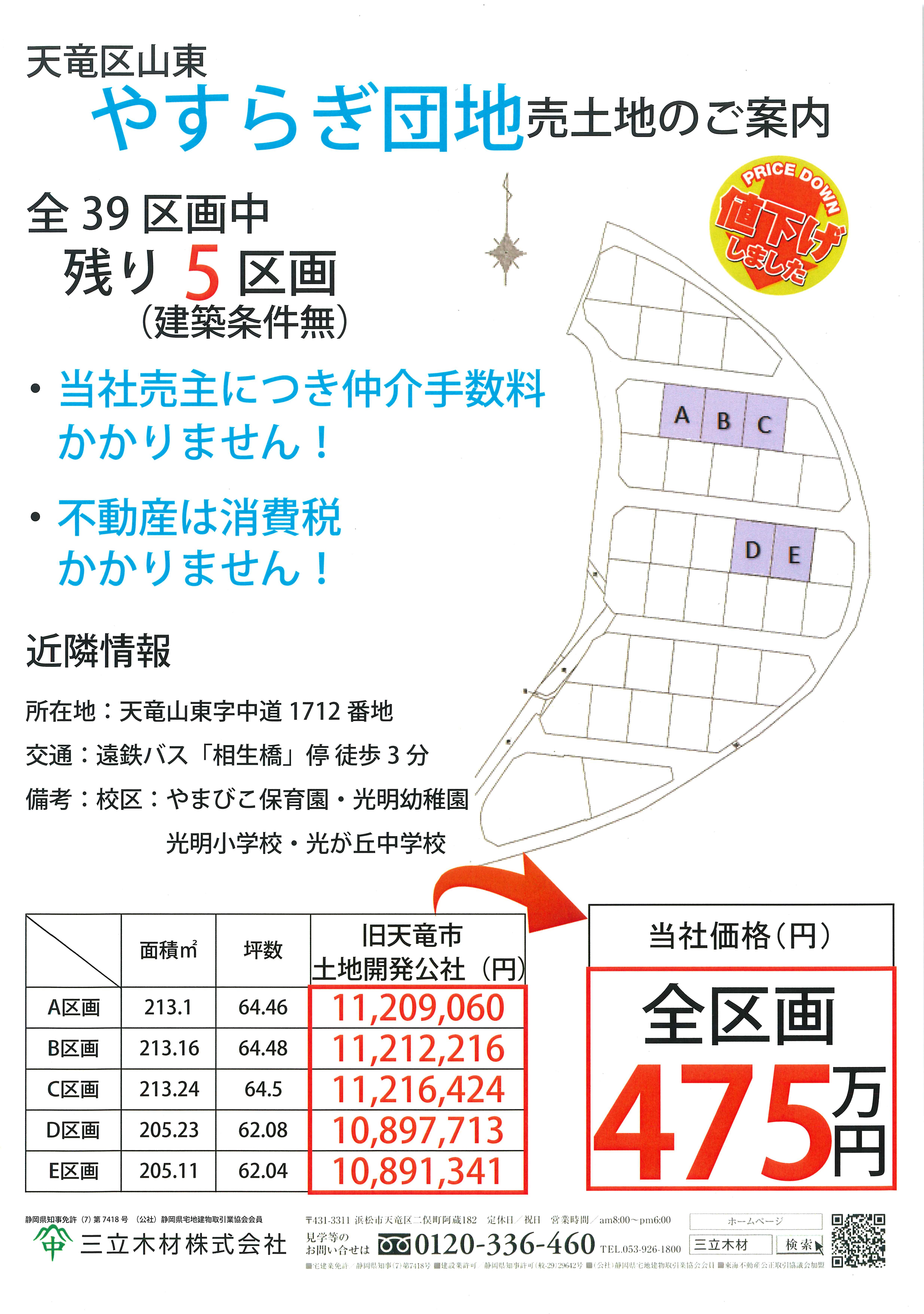 BLOG 不動産 2019.07.09 やすらぎ団地価格改正しました こんにちは! 三立木材 不動産部の鈴木です。 不動産ブログは初投稿で緊張してます(>A<) 「平成」から「令和」に変わり、はや2ヶ月過ぎました。 じめじめと蒸暑い時期が続いていますが それに負けないくらい元気に活動しています。 今回、不動産部では自社物件の売土地価格を一部改正しました。 その第一弾として山東のやすらぎ団地の5区画の金額を値下げ致しました! これを期に色々お話を聞きたい質問したい等ございましたらお気軽に当社にお電話下さい category 新築 リフォーム スタッフ イベント entry 2023.08.28 \大盛況/ 健幸セミナー開催しました。 2023.07.31 高校生の就業探求を行いました。 2023.06.19 健幸イベントのご案内 2023.05.31 木の持つ自然美と癒し 2023.04.04 志を持とう 高め合おう 2023.03.27 浜松市社協さまと協定を結びました。 2023.03.07 こども食堂にお菓子を寄贈しました。 2023.01.23 第4回 健康セミナーのご案内 2023.01.18 2023年 お得な国の補助金制度 ご案内 2022.12.26 はままつ木好きの輪プロジェクト « 次へ 一覧 前へ »